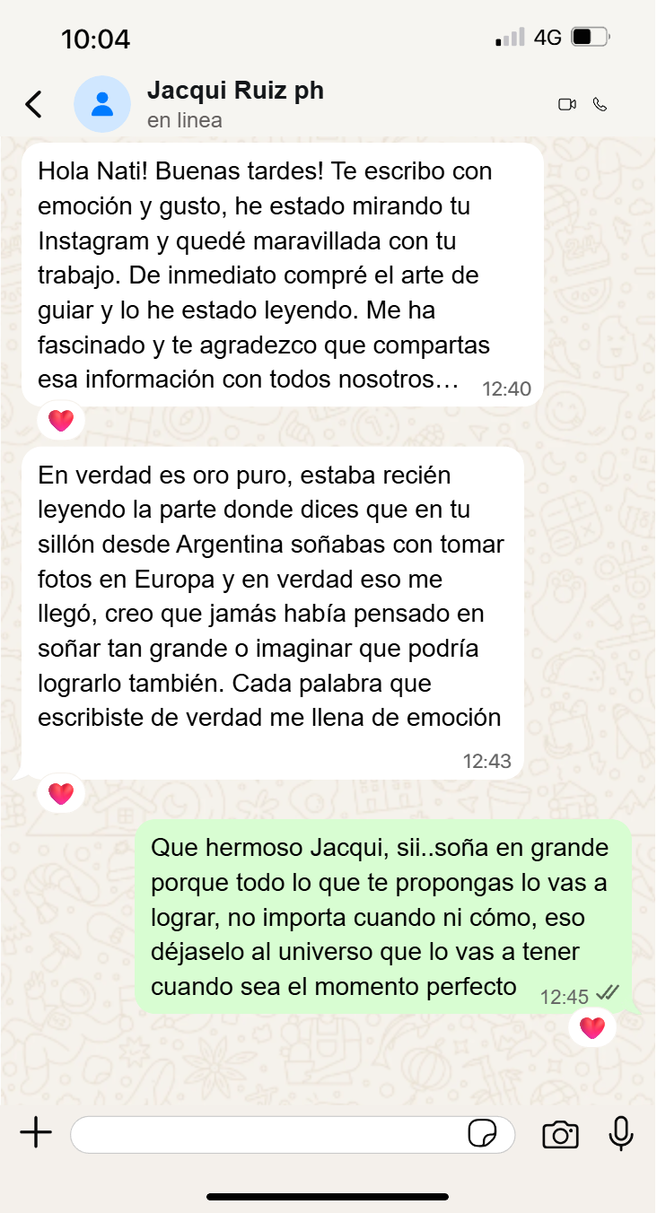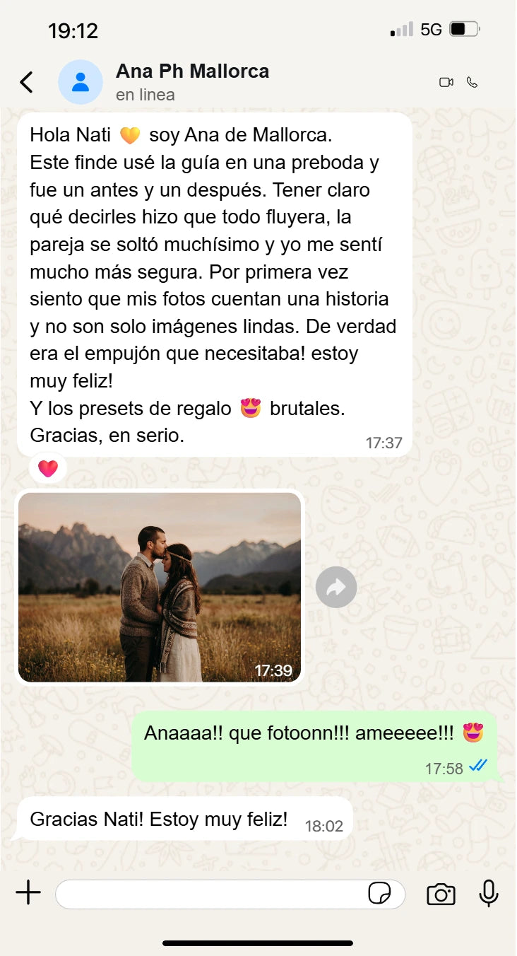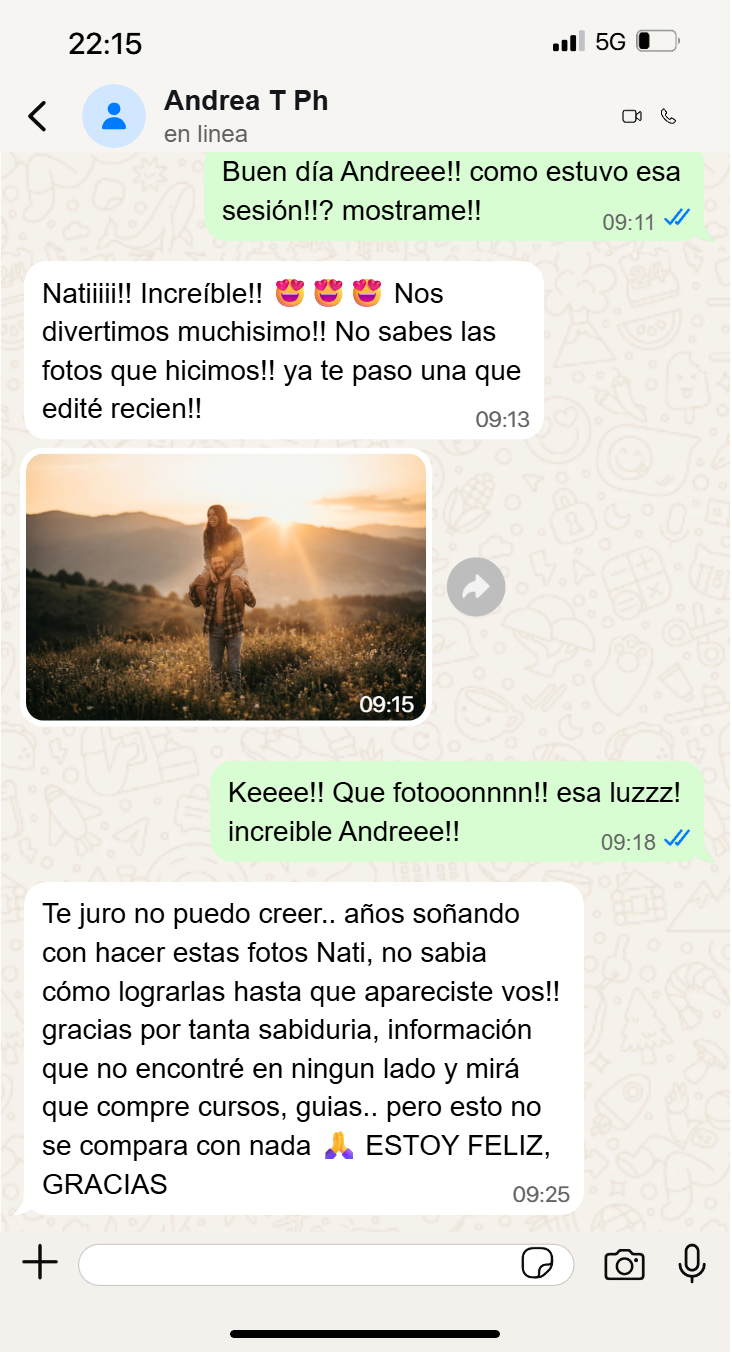 100% RECOMENDABLE!! "Me encantó, la verdad es que las guias me dieron muchisima seguridad a la hora de hacer las sesiones, me ponia muy nerviosa y ahora voy muy preparada. Realmente me ayudo muchisimo y se refleja en mis fotos. Gracias Nati"